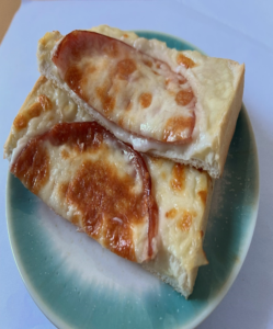 保育園で人気のおやつメニューです。ハムとチーズを乗せて焼くだけでも美味しいのですが、園ではひと手間かけてホワイトソースを塗って提供しています。