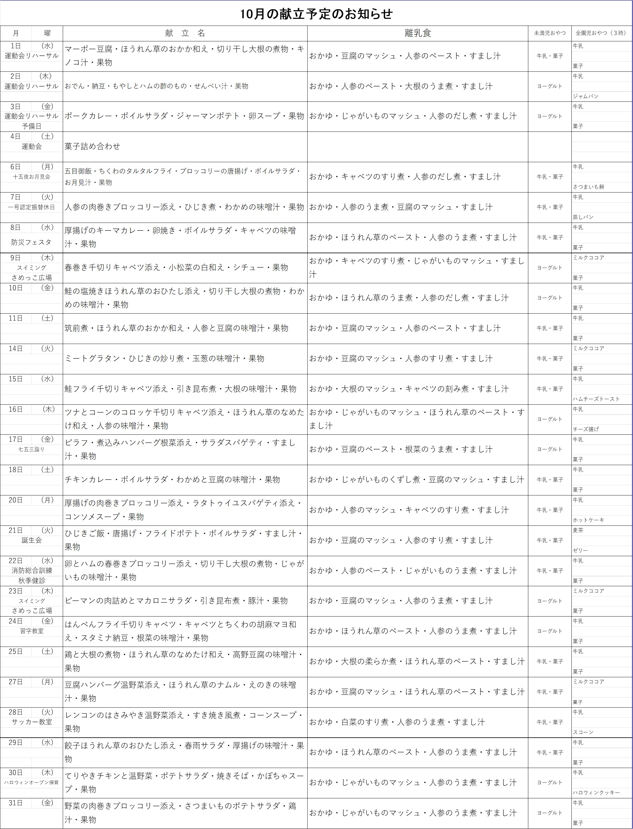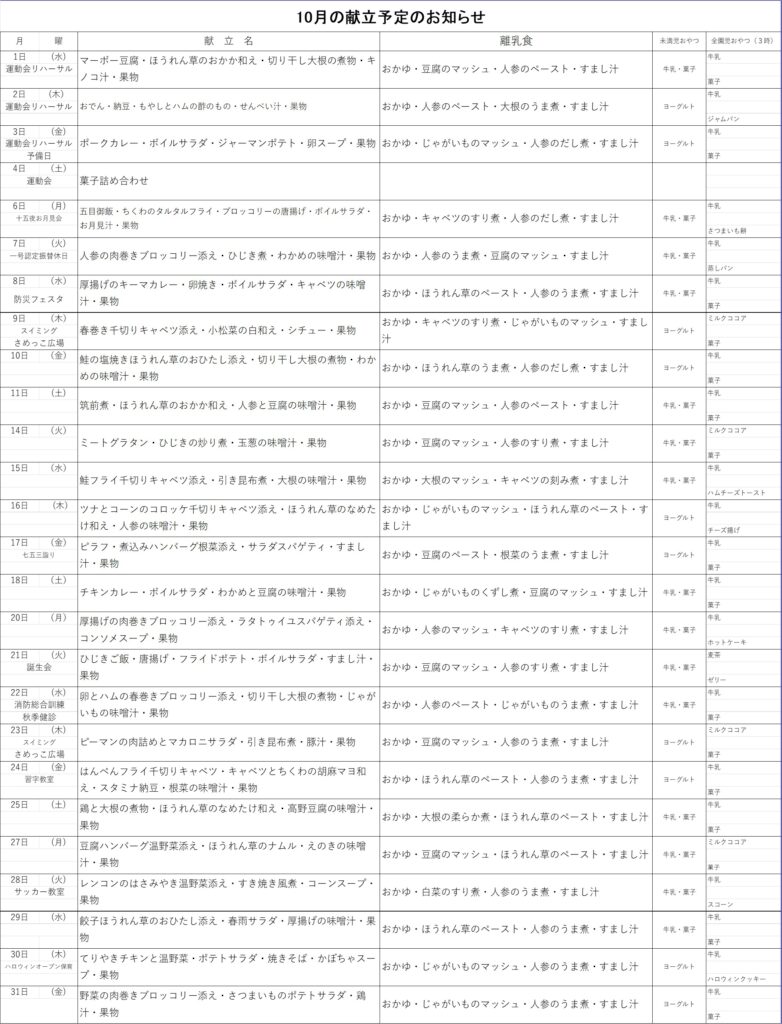 秋の風がふき、過ごしやすい季節となりました。子どもたちの運動量も増えたと同時に、食べられる量もおかわりの回数も増えたと思います。