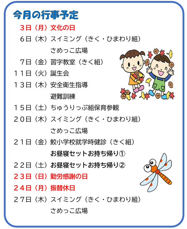 先月は運動会や防災フェスタをはじめ、行事が盛りだくさんでしたね。様々な経験の中で責任感を持って最後まで頑張る力を養いながら、また一つ、大きく成長することが出来ました。