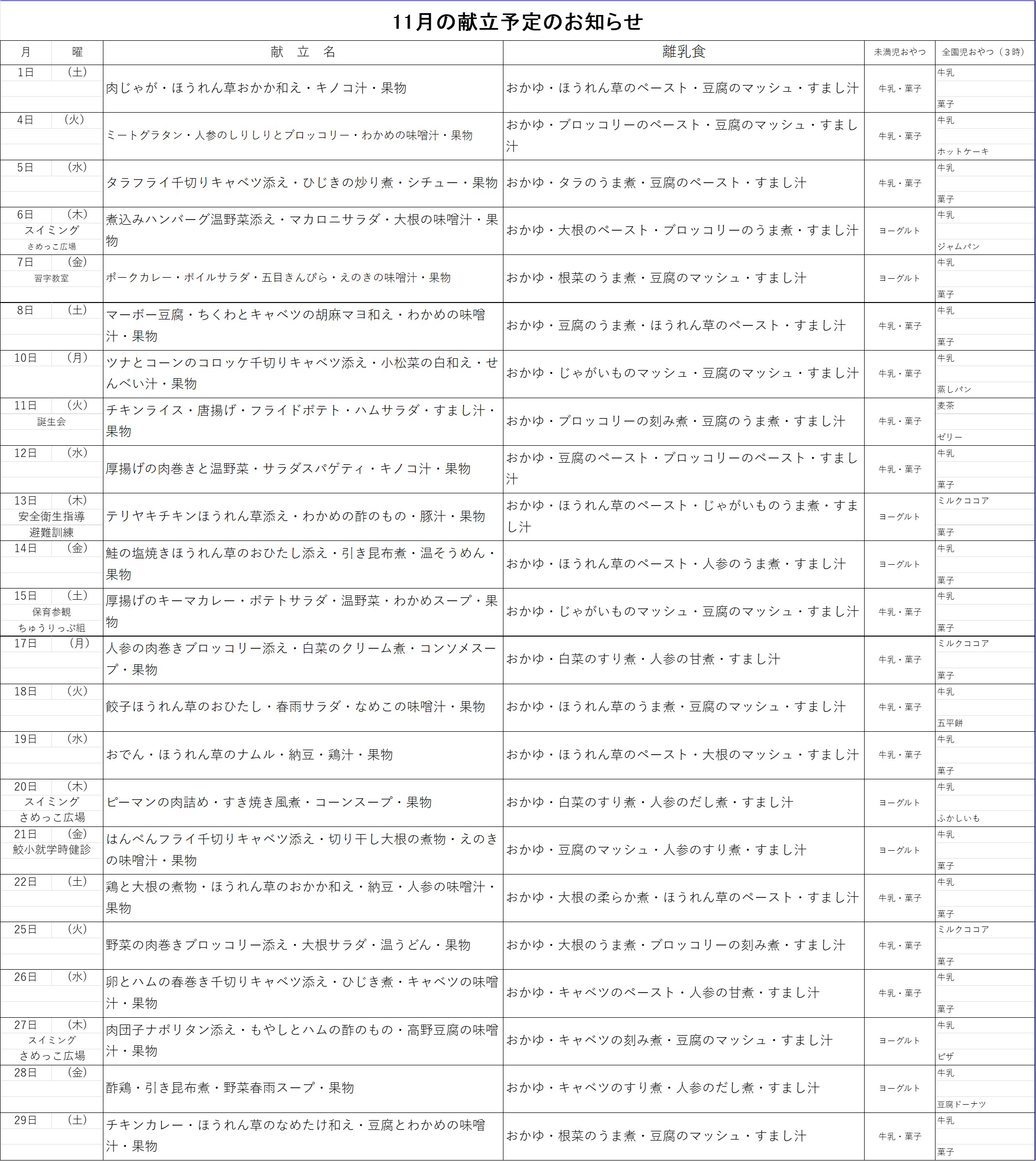 だんだんと寒くなり冬の気配がしてきました。先月は園で立派なさつまいもが収穫でき、スィートポテト、サツマイモサラダ、大学芋にして美味しくいただきました。