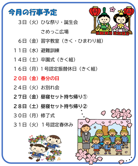 寒さの中にも春の暖かな日差しや便りが聞かれる頃となりました。子ども達は『もうすぐたんぽぽ組~』と進級に期待を膨らませています。